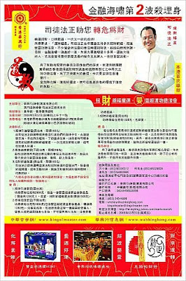 司徒法正師傅運用道家法科招財催運的靈驗法門,替善信祈福開運,招來五路財神,無論正財善財橫財偏財隱財,均無所缺。